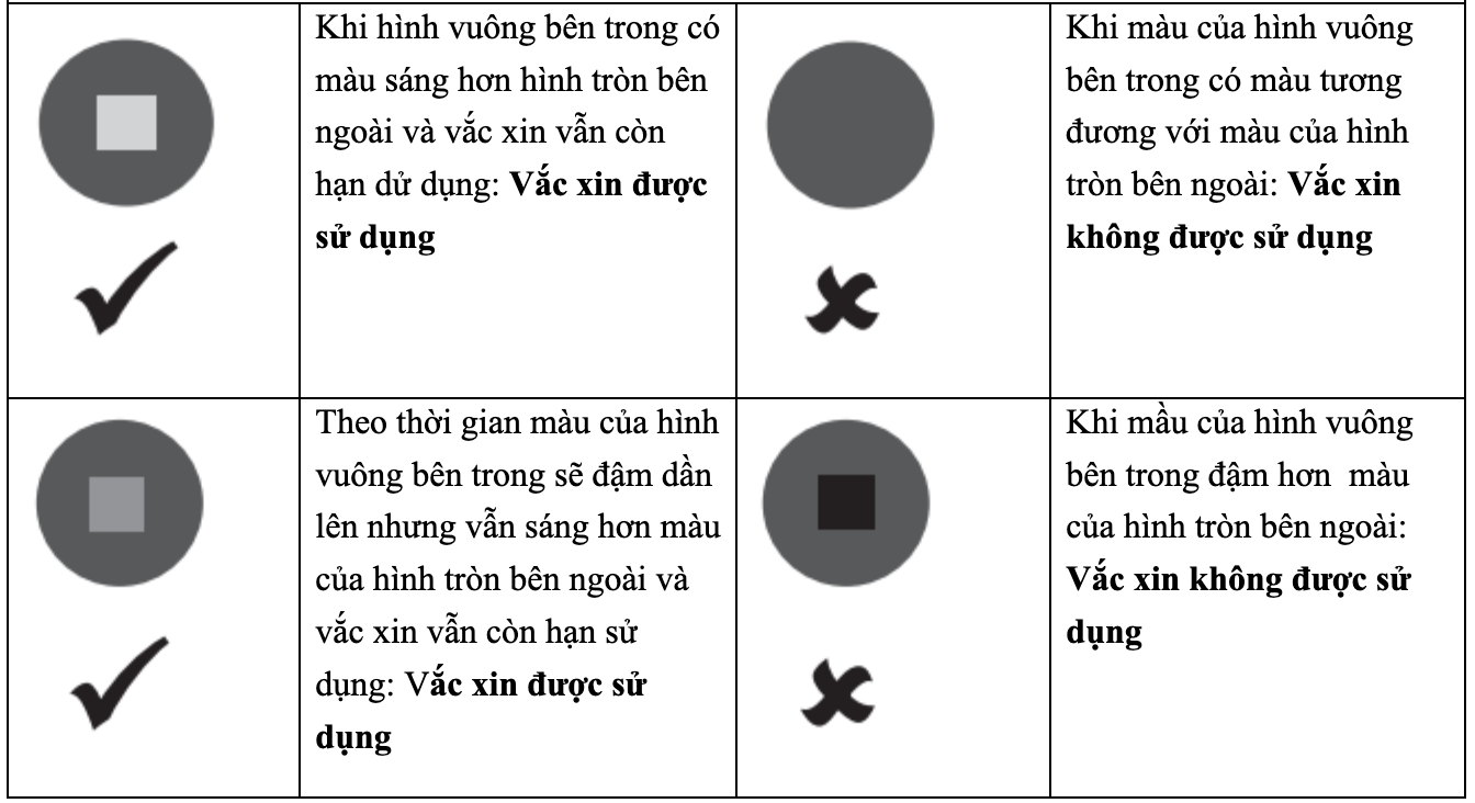 Cách tiêm:Chú ý: Chỉ sử dụng lọ vắc xin khi hình vuông bên trong sáng hơn hình tròn bên ngoài của chỉ thị nhiệt VVM
